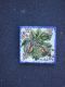 quadratische Keramik mit kunstvoll verschlungenen gelb-grünen Blüten und Zweigen; in der Mitte eine gelbe Sonne