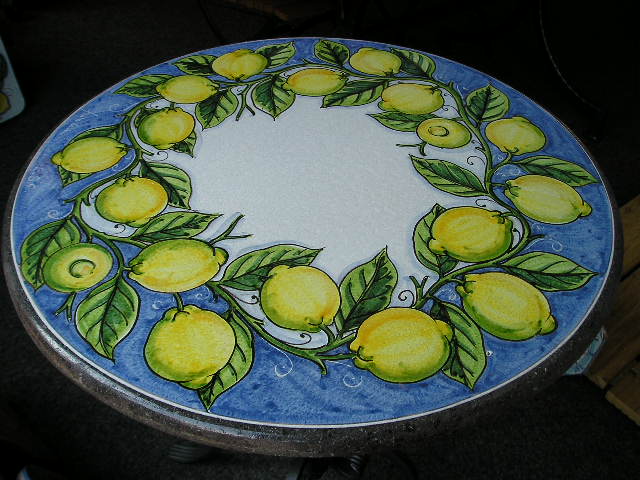 Runde Tischplatte (Durchmesser 60cm) außen blauer Rahmen; innen Kranz aus Zitronenranken
