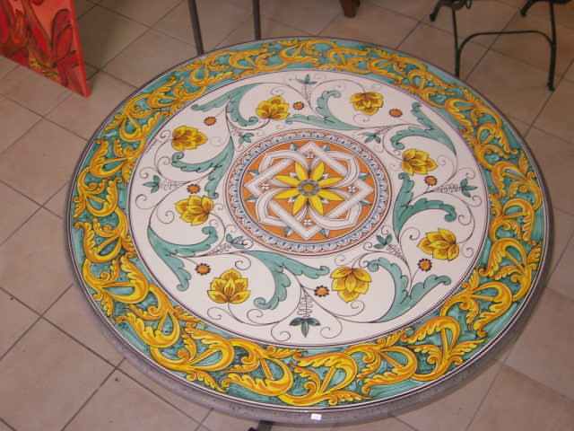 Außen grüner Hintergrund mit kunstvoll verschlungenen gelben Blüten; nach innen hin eine weiße Fläche, in der sich ineinander verschlungene gelb-orange Blüten mit grünen Blättern befinden; die Mitte zeigt eine kunstvoll verzierte orange-weiße Blüte, die von eine blau-weißen Muster in einem Ring umschlossen wird.